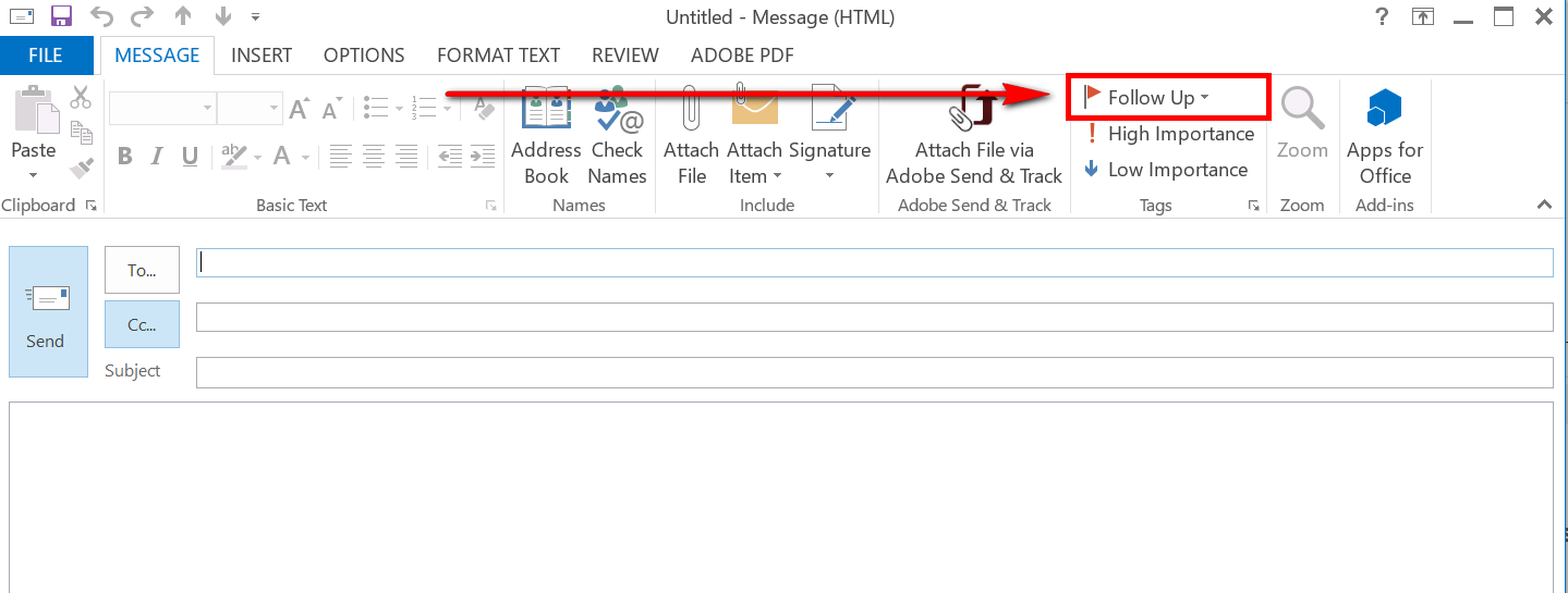 On the new message window that pops up, you’ll see a drop-down called “Follow Up”. This is where you can set up pop up reminders for important requests you have from other people—prompting them to follow up and respond to their email.