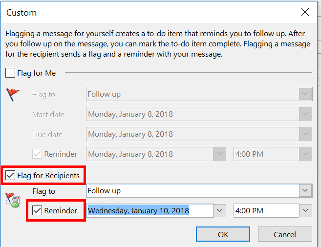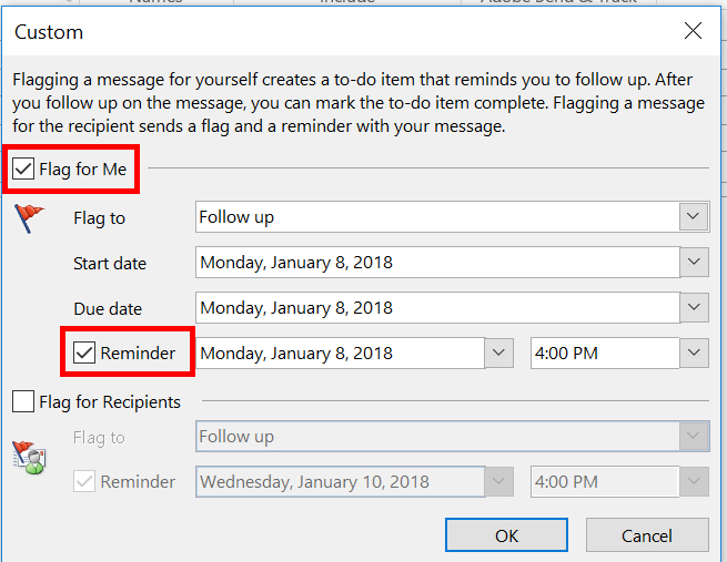 Set up a new reminder by clicking “Add Reminder” again on the Follow Up tab. Check the box beside “Flag for Me”: