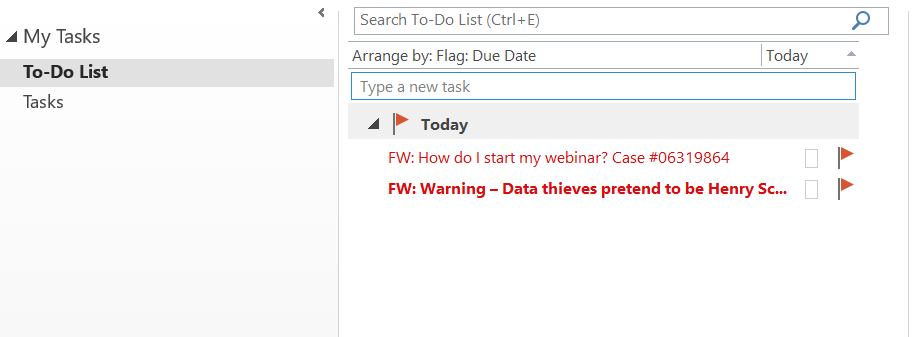 In the Tasks folder, you should see a To-Do List—that is a list of all of the flagged emails that have not been marked complete.